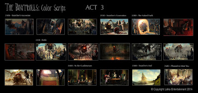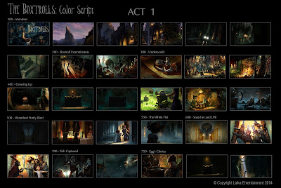 I just realized I never posted the color script I did for The Boxtrolls. Here it is! Via this script, I designed all the color and lighting for each sequence of film. It's a combination of paintings I did specifically for the script, as well as some of the set design paintings (painted by the amazing August Hall and Ean McNamara...and myself) that I tweaked to fit into the script. Most of the layouts were done by Michel Breton, Tom McClure, and Mike Smith (also amazing!)